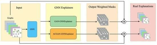 where N represents the total number of samples and denotes the class label for instance i. The terms and refer to the prediction probabilities for class based on the original graph and the occluded graph , respectively. The occluded graph is created by removing the important features (explanations) identified by the explainers from the original graph. A higher value is preferred, indicating a more critical explanation. On the other hand, refers to the prediction probability for class using the explanation graph , which contains the crucial structures identified by the explainers. A lower value is desirable as it reflects a more complete and sufficient explanation.