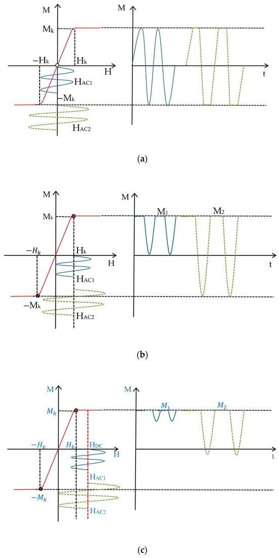 ) is applied, the magnetization response is sinusoidal and contains the fundamental frequency; the magnetization response obtained by applying a large-amplitude AC magnetic field (