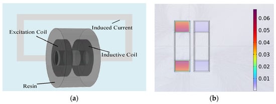 Figure 1b shows the magnetic flux density distribution of the sensor probe, which is obtained through finite element simulation. The excitation coil magnetically couples with the sensing coil through the conductive liquid, inducing magnetic flux in the magnetic core of the sensing coil. This, in turn, generates an electromotive force (EMF) in the sensing coil, which is then used to measure the conductivity.