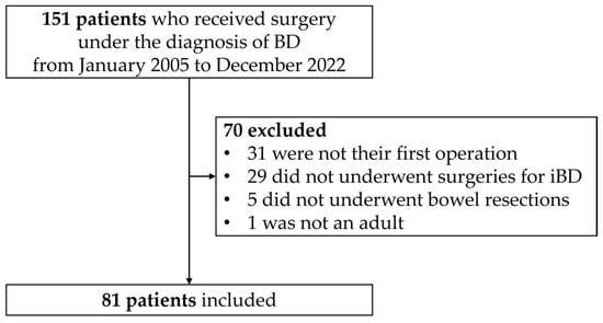 This was a retrospective case-control study that collected data until June 2024 from patients who underwent surgery for iBD in a tertiary, private teaching hospital (Severance Hospital, Seoul, Republic of Korea) between January 2005 and March 2023. Eligible patients were those aged >18 years who had undergone surgery with a diagnosis of BD. Patients whose diagnosis was not iBD, those who did not undergo initial bowel surgery, and those who did not undergo bowel resection were excluded. Patient consent was waived due to the retrospective nature of the study. Ethical approval for this study was provided by the Institutional Review Board of the Severance Hospital, Yonsei university, Seoul, Republic of Korea, on 16 July 2023 (IRB No. 4-2023-0658). The study was performed in compliance with the STROBE and STROCSS guidelines [