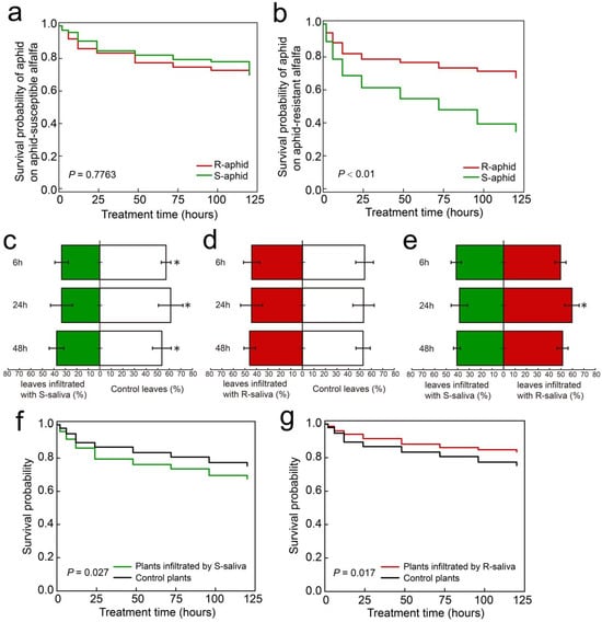 At the 6th, 24th, 48th, and 72nd hours after being infiltrated by T. trifolii’s saliva, there was no significant difference in the expression levels of ICS (a key synthetic gene of salicylic acid) of WL343 leaves infiltrated by S-saliva and R-saliva (Figure 5e). At the 6th, 24th, and 48th hours after being infiltrated by T. trifolii’s saliva, ICS expression level of WL343 infiltrated by S-aphids (6 h, 2.32 ± 0.35; 24 h, 3.02 ± 0.59; 48 h, 2.63 ± 0.40) and R-saliva (6 h, 2.37 ± 0.39; 24 h, 3.50 ± 0.51; 48 h, 2.52 ± 0.37) were both significantly higher than the blank control (6 h, 1.09 ± 0.06; 24 h, 1.10 ± 0.11; 48 h, 1.07 ± 0.03) (6 h, S-saliva infiltration vs. control treatment, z = 15.84, p < 0.05; 6 h, R-saliva infiltration vs. control treatment, z = 20.44, p < 0.05; 24 h, S-saliva infiltration vs. control treatment, z = 11.94, p < 0.05; 24 h, R-saliva infiltration vs. control treatment, z = 13.29, p < 0.05; 48 h, S-saliva infiltration vs. control treatment, z = 23.15, p < 0.05; 48 h, R-saliva infiltration vs. control treatment, z = 10.95, p < 0.05). At the 72nd hour after being infiltrated by two strains of T. trifolii’s saliva, the ICS expression level of WL343 returned to a level which had no significant difference compared to the blank control.