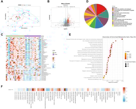 To further explore the influence of the sex-specific metabolites on sex differences in AF, the transcriptomic signature of the left atrium in male patients and female patients with AF compared to those with sinus rhythm (SR) were analyzed, respectively. For male patients, 2205 DEGs were observed between the AF and SR groups under the settings of |log2FC| > 1 and p < 0.05. Among them, 2179 were upregulated DEGs and 26 were downregulated DEGs (Figure 3A). Consistent with the high levels of series of metabolites including amino acids, peptides and their analogs, indoles, fatty acids and their conjugates, and fatty acid esters, GO analysis highlighted that the DEGs of the left atrium in male patients with AF were mainly involved in metabolic process. Mitochondrial-related pathways were represented multiple times, along with the generation of precursor metabolites and energy and the positive regulation of cellular catabolic process (Figure 3B). In comparison, there were 550 DEGs between the AF and SR groups in female patients, of which 508 DEGs were upregulated and 42 DEGs were downregulated in the AF group (Figure 3C). GO analysis showed that the DEGs of the left atrium in female patients were concentratedly involved in the immune response and regulation based on immune cells, cytokines, and chemokines (Figure 3D), which suggested the probable influence of metabolites like Glycerophosphocholine and phosphatidylcholine, which were higher in female patients with AF. And, it is worth noting that only 288 DEGs were commonly regulated in male and female patients when comparing the AF group and SR group. However, there were 1917 DEGs only specifically regulated in male patients and 262 DEGs specifically regulated in female patients (Figure 3E). Considering the significant association between 7-Methylguanosine, succinic acid, and AF, the expression of genes related to the metabolism of them were further compared (Figure 3F). QKI was significantly increased in the left atrium of male patients with AF compared those with SR, which was reported to modulate 7-Methylguanosine modifications in tRNA. The expression of QKI was not significantly altered between the AF and SR groups in female patients. The gene related to the metabolism of succinic acid, SUCLA2, was significantly increased in the left atrium of male patients with AF compared those with SR (fold change = 1.53; p = 0.008), while it had little change in female patients. SUCNR1 was obviously raised in the left atrium of female patients with AF but not in male patients.