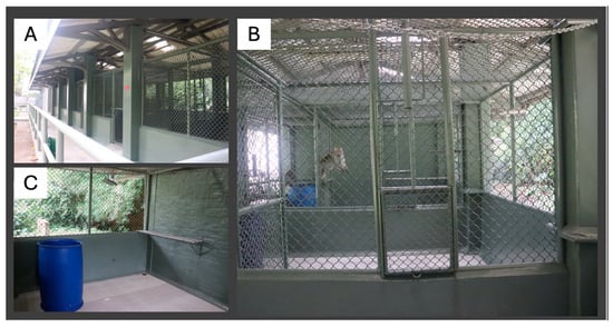 Figure 1). The housing consisted of three interconnected pens that could be separated using sliding-door dividers, each unit being 2.25 m high with a 10.41 m