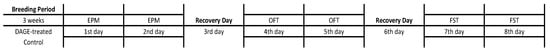 21], to evaluate the potential effects of DAGE on anxiety-related behavior in two mouse strains, BALB/cCrSIc and C57BL/6NCrSIc, which are known for their differing stress response strategies. The EPM test examined the ameliorative effects of DAGE on the exploratory behavior of mice in novel environments and their anxiety stemming from conflict behaviors due to the elevated open arms. The OFT was designed to measure whether DAGE ameliorate general anxiety behavior in mice. The FST was designed to investigate the antidepressant effects of DAGE in mice. Additionally, our research sought to explore behavioral differences between two testing sessions across these experiments [