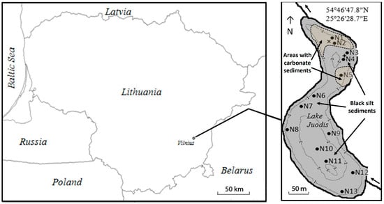 A study conducted on the processes influencing gas ebullition fluxes from sediments was in the northern shallow bottom terrace (depth ~1.0–1.6 m) of Lake Juodis (54°46′49″ N, 25°26′29″ E). This lake, having areas with distinct types (carbonate and black silt) of sediments, is located near Vilnius (17 km to northeast). It is a flowing shallow lake within a chain of lakes (