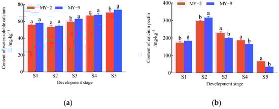 During the development and maturation of Cerasus humilis, the proportions of different calcium forms in the fruits and fruit stalks exhibited fluctuating changes, indicating that calcium forms can interconvert during fruit maturation. Previous studies on apples and kiwifruits have demonstrated that calcium can interconvert within the fruit, and the results of this study are consistent with those findings [37,38]. The proportions of the four main calcium components were similar in the fruit stalks, while in the fruits, there were significant differences, with water-soluble calcium and calcium pectin being the dominant forms. At the fully ripe stage, the sum of water-soluble calcium and calcium pectin in the fruits of both Cerasus humilis types approached 70%, making them the most prevalent calcium forms in the fruit. The proportion of calcium pectin exhibited clear differences between the two types in the fruits and fruit stalks. In the MY-2 fruits, the proportion of calcium pectin was significantly higher than in the fruit stalks, indicating that calcium pectin is more readily transported from the fruit stalk to the fruit. Conversely, in the MY-9 fruits, the proportion of calcium pectin was lower than in the fruit stalks, suggesting that calcium pectin tends to accumulate in the fruit stalks. This difference could be the primary factor contributing to the variation in calcium content between the two types. The application of 2,4-D altered the distribution of the four major calcium components in the fruit stalks, increasing the proportions of water-soluble calcium and calcium pectin while reducing the proportions of calcium phosphate and calcium oxalate. Furthermore, 2,4-D treatment increased the proportion of calcium phosphate and calcium oxalate in the fruit, suggesting that 2,4-D may promote the transport of these forms from the fruit stalks to the fruits. This effect may be due to hormone regulation of cell expansion, cell wall modification, xylem development, and phloem sucrose unloading. Calcium is known to participate in signaling pathways involving gibberellins, auxins, and abscisic acid, which regulate processes such as fruit set, ripening initiation, cell proliferation, and fruit softening. These physiological changes likely influence calcium distribution within the fruit [39]. The proportions of calcium forms in the fruit stalks and fruits showed clear differences between the young fruit stage and the fully ripe stage, with the most significant changes occurring between the hard–ripe stage and the fully ripe stage. These two stages are critical for calcium changes, transport, and accumulation.