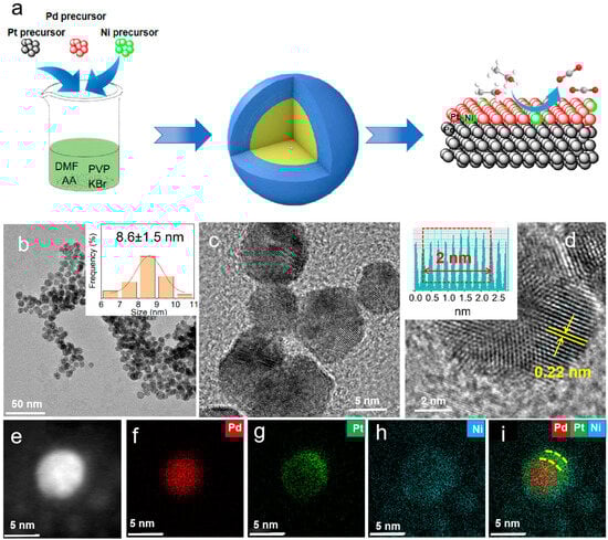 Figure 1a, in the synthesis process, platinum acetylacetonate, palladium acetylacetonate, and nickel acetylacetonate were selected as metal precursors. AA was used as the reducing agent, KBr as the structure-directing agent, PVP as the stabilizer, and DMF as the solvent. The core–shell structured PdNi@NiPt NPs were obtained using a solvothermal method. As a contrast, the PtNi nanoparticles (