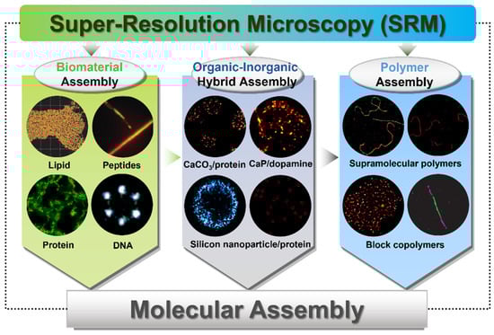 Synthetic polymers are macromolecules in which small structural units are connected by covalent bonds [148]. Supramolecular polymers are constructed by monomers that are linked by non-covalent bonds instead of covalent bonds, and they typically include hydrophobic interactions and hydrogen bonding [148]. Their modularity and responsiveness to different stimuli, together with their dynamic nature, means they are extensively used in technology and everyday life and are promising candidates for several applications in optoelectronics, catalysis, biomedicine, and sensing [148]. Over the decades, various instruments and methodologies have been applied to elucidate the morphology and architecture of polymers. How to decode the formation mechanisms, as well as the bulk structures of different polymers, have fascinated researchers for a long time. The cutting-edge SRM tools have had rapid and widespread use in biology and related fields for a long time; however, their implementation in materials, and more specifically in polymer science has been very slow [149,150,151]. Nevertheless, several reports have demonstrated that SRM is a powerful method for studying the dynamics and structures of polymers as well as supramolecular polymers, providing abundant complementary information compared with that attained with ensemble techniques (circular dichroism, UV spectroscopy, and X-ray scattering), and conventional techniques without the need for fluorescence label imaging (TEM, SEM, and AFM) [149]. Based on recent reports, SRM has also been served as a powerful technique in polymer science, including structural characterizations and polymerizations, solution and self-assembly behaviors, bulk structures and behaviors, gel structures and behaviors, phase transitions, and crystallizations [149].