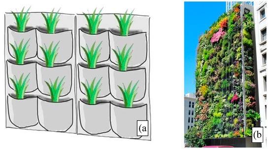 Figure 1a) is composed of two layers of synthetic fabric. The external layer, usually made of felt or plastic sheets, consists of a pocket-shaped container that is filled with a planting medium and is used to favour the plants rooting. The internal layer is a waterproof membrane to preserve building facades from water and high moisture. The layers are supported by a framework directly fixed to the building wall. The modular systems (