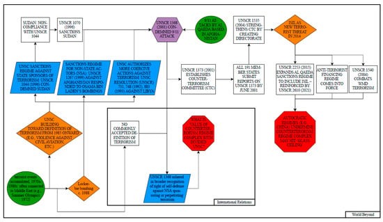 Figure 2 initiates multiple pathways with a micro-level component in the World Beyond: ‘terrorist events accumulated, 1970s–1980s, often connected to Middle East (e.g., Summer Olympics 1972)’ → ‘Lockerbie bombing c. 1988’; ‘UNSC BUILDING TOWARD DEFINITION OF TERRORISM FROM 1985 ONWARD (E.G., VIOLENCE AGAINST CIVIL AVIATION, ETC.)’; ‘NO COMMONLY ACCEPTED DEFINITION OF TERRORISM’.
