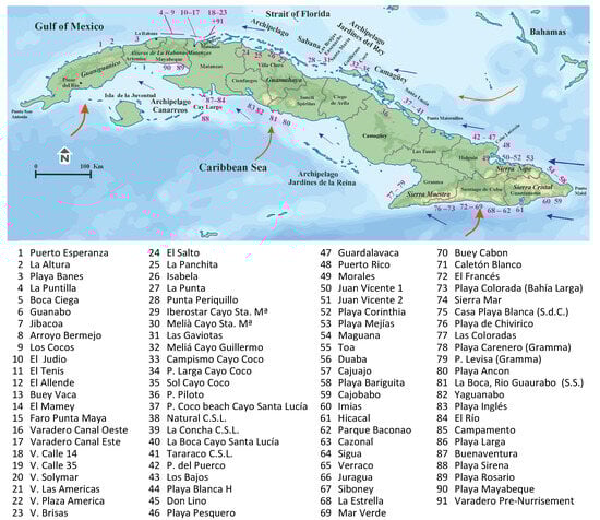 40]. The main directions of arrival of waves and coastal drift under normal wind conditions are from the first quadrant for the northern coast and from the second quadrant for the southern coast of Cuba. In winter, under cold front conditions, the dominant sediment transport direction is westerly. Extreme events (hurricanes) mainly arrive from the Caribbean Sea and the Gulf of Mexico, mostly affecting the west of Cuba and the southeastern areas and, to a lesser extent, the southern central coast and the northern keys [