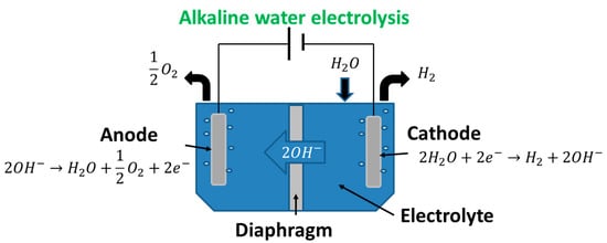 Water electrolysis systems are all based on the water splitting reaction as shown in Equation (1). This overall reaction relies on electrons being transferred through an electric circuit from the anode to the cathode. However, the reactions which occur at the anode and cathode depend on the type of electrolysis system, with one of the common designs and the associated reactions shown in