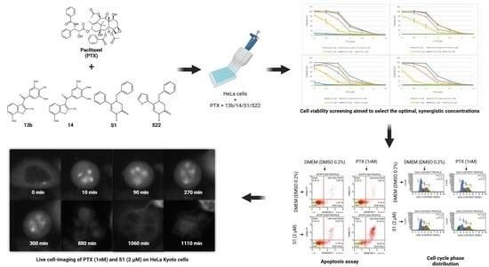 Our study revealed that HeLa cells treated with a combination of PTX (1 nM) and 13b, 14, S1, or S22 at the selected concentrations exhibited a considerable increase in the apoptotic cell population compared to the control and PTX alone. Furthermore, the level of apoptosis induced by the combination of PTX and S1 was significantly higher than that induced by S1 alone.