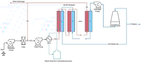Once heated, the feed enters the membrane distillation (MD) modules as stream S2 to achieve the target concentration. The cold stream is introduced into the MD modules in a counter-current flow configuration to maximize the temperature gradient, exiting at the opposite end. Afterwards, the cold flow undergoes further cooling via a cooling tower or pond.