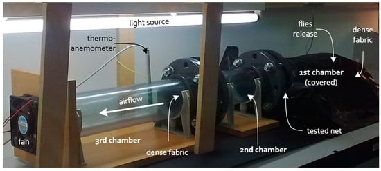 Regarding airflow velocity, the efficacy measurements varied with different airflow velocities (0, 1.5, and 3.0 m/s). For example, in net 3 at ↓T, the efficacy was 100% at 0 m/s but dropped to 86.0% at 3.0 m/s. In the case of net 4, the efficacy decreased significantly when the air velocity increased from 1.5 to 3 m s−1, and this is one of the fabrics with the greatest thickness tt (566 μm). This trend is consistent across most nets, indicating that increased airflow velocity may facilitate the passage of D. suzukii, potentially due to increased pressure or turbulence disrupting the nets’ barrier protection.