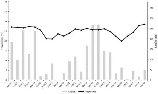 The experiment was conducted under rainfed conditions in the 2021/2022 and 2022/2023 seasons in an experimental area in the municipality of Selvíria, State of Mato Grosso do Sul, Brazil (22°25′5″ S and 51°20′30″ W), at an altitude of 335 m. The climate classification of the region, according to Köppen, is Aw, with an average annual rainfall of 1370 mm and an average annual temperature of 23.5 °C [