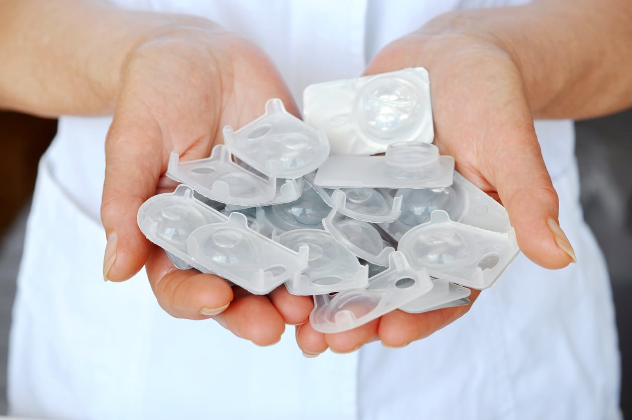 Soft contact lenses come in daily, monthly, quarterly and annual disposal packages. Researchers found full-time, daily disposable contact wearers generate 27% more waste annually than people who choose reusable lenses.