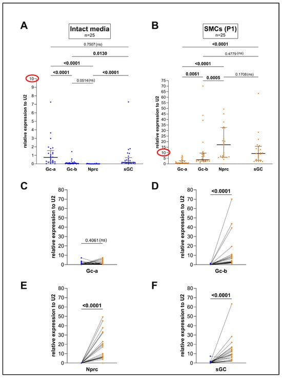 The investigated genes GC-B, NPRC, and sGC showed a dramatic increase in transcription in the cultured primary SMCs when compared to the corresponding intact aortic media (see