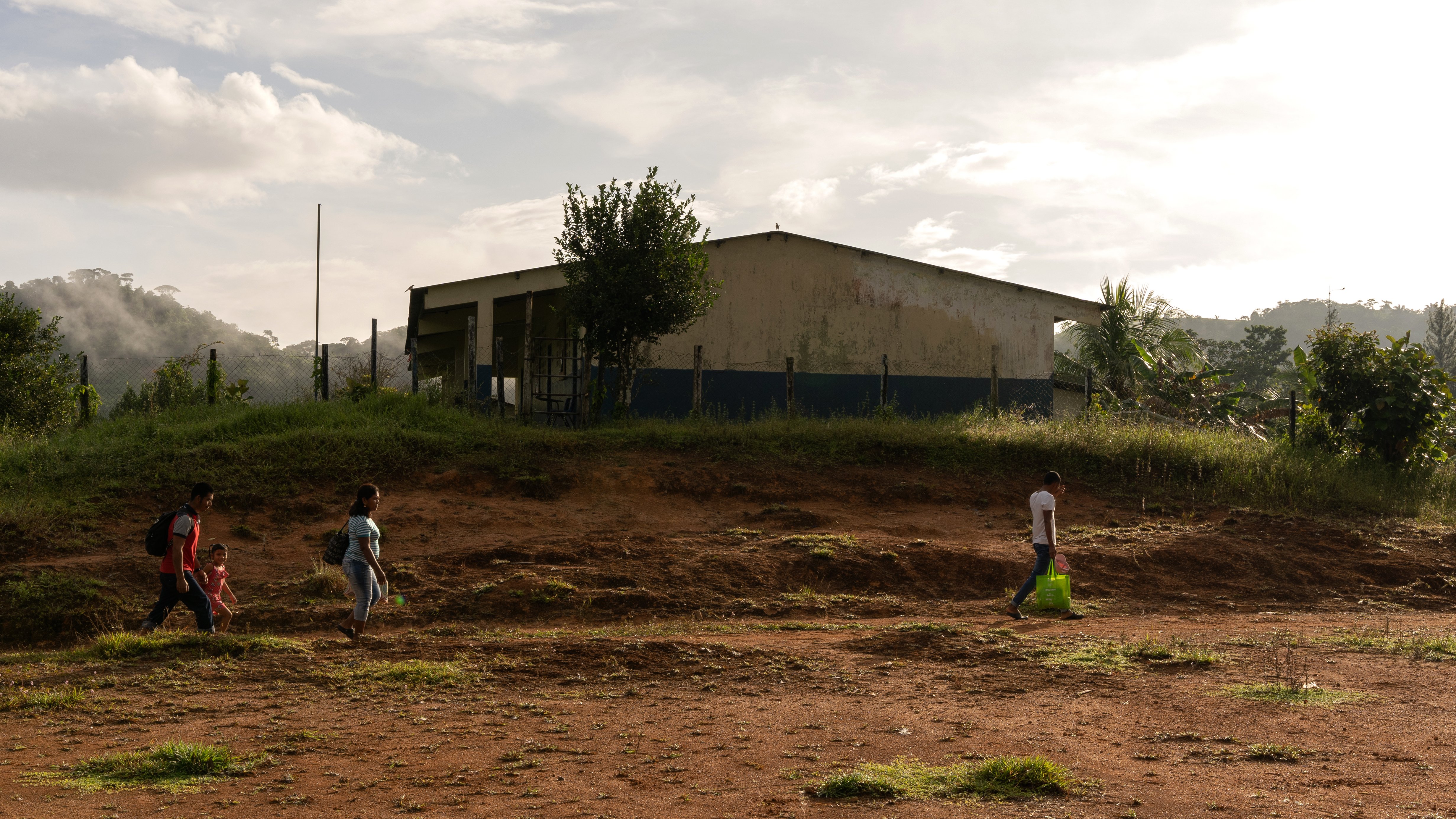 Residents of El Limón, a town in the Río Indio river basin, walk past a multigrade school building.