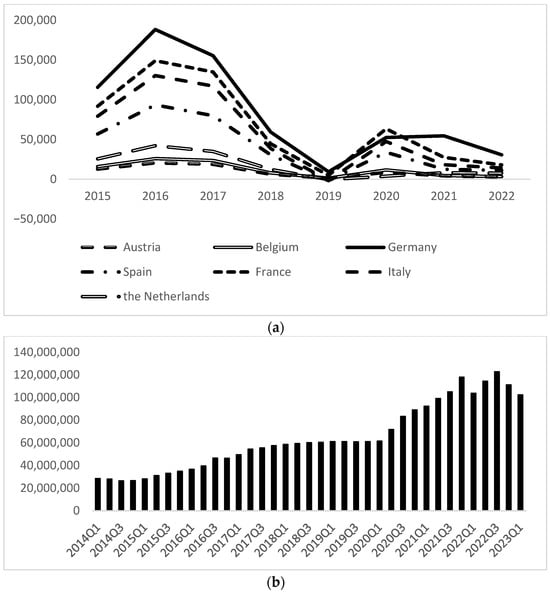 Agba et al., 2022). Additionally, it provides insights into the asset composition of the ECB’s balance sheet. During the initial years (2015–2017), all observed European countries experienced a consistent growth in asset purchases. The primary driving force behind this exponential surge was the spillover of the Great Recession into Europe, coupled with the debt crisis that the EU faced during those periods. Germany stands out with the highest values, while Austria and the Netherlands exhibit a more moderate increase in purchases. Belgium and France display smaller fluctuations, while Spain and Italy maintain a steady growth trajectory. The fluctuations in the APP program across countries are influenced by various factors, including the public debt of each nation, the size of its economy, and the current economic circumstances (