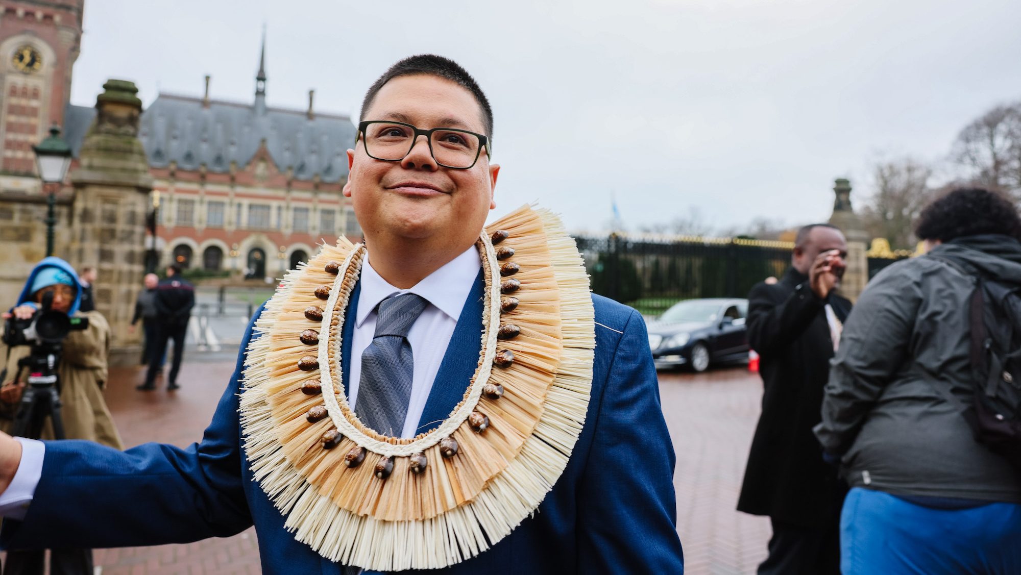 Julian Aguon wore a dark blue suit and garland made of white coconut fronds, brown hibiscus tree bark, and brown cowry shells. Under the arched ceilings and chandeliers of the Peace Palace in The Hague, he stepped to the podium to make his case to the International Court of Justice.