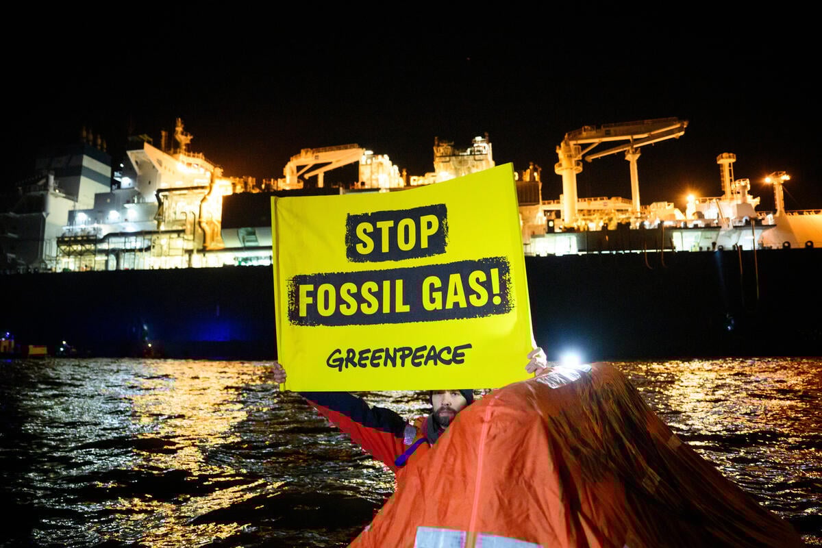 Brunsbüttel, Germany – Onboard floating devices, 22 Greenpeace activists from Germany are protesting the arrival of the tanker Celsius Gandhinagar loaded with liquefied fossil gas (LNG) from the United States, entering the port of Brunsbüttel. Activists have attached a 100-meter-long banner saying “Gas destroys – Stop fossil gas” to the floating gas terminal and set up a floating protest camp. The tanker left from Calcasieu Pass LNG Terminal in Louisiana, and is the first one traveling from the US to Germany since the US election.