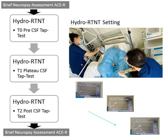 19], we performed a Hydro-RTNT in an iNPH setting. The neuropsychological protocol was administered at the patient’s bedside, immediately before the infusion test (T0), when a stable pressure plateau was reached (T1), and immediately after CSF subtraction at the end of the tap test (T2). We hypothesized that fluctuations in cognitive performance between T0 and T1 (at the end of the infusion phase, when the intracranial pressure was maximal) would indicate that changes can be observed in real time in patients with iNPH owing to the increase in intracranial pressure. Thus, the cognitive aspect may become a relevant evaluation index in future tap test responders. Furthermore, possible fluctuations in cognitive performance between T0 and T2 (after CSF subtraction, when the intracranial pressure reached values near 0 mmHg) would suggest that there may be improvements due to CSF drainage during the tap test.