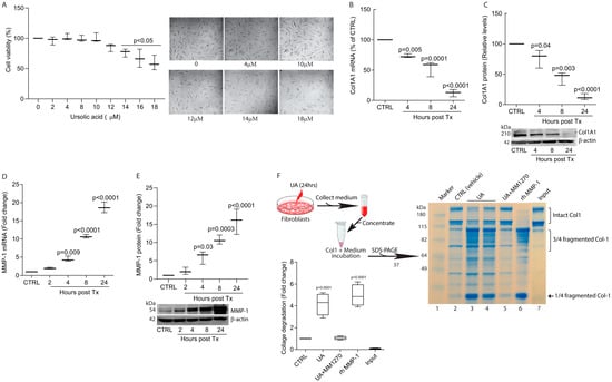 The tissue response to disease and injury results in the deposition of a dense scar through processes collectively known as fibrosis [1]. Fibrosis, marked by the excessive accumulation of collagen, is a common pathological feature of various chronic diseases that affect organs such as the liver, lungs, kidneys, heart, and skin [2,3]. Dysfunctional healing by fibrotic scarring results in structural abnormalities and eventually leads to organ malfunction, leading to lifelong disability, which places a substantial burden on public health [4]. Collectively, fibrosis is implicated in 45% of all deaths in the U.S. [5]. As fibrosis is increasingly recognized as a significant cause of morbidity and mortality in many chronic diseases, effective treatments are emerging in certain conditions. For example, liver fibrosis due to HCV can resolve within 12 months of treatment [6], bone marrow fibrosis can significantly improve after stem cell transplantation [7], and SGLT2 inhibitors have been shown to reduce kidney fibrosis in some patients [8]. These advancements highlight the potential effectiveness of targeted therapies in addressing fibrosis; however, such efforts require a comprehensive understanding of the underlying mechanisms to be effectively developed and implemented. In recent years, researchers have explored natural compounds with potential antifibrotic properties. Ursolic acid (UA) has gained attention for its diverse biological activities, including anti-inflammatory, antioxidant, and potential antifibrotic effects [9,10,11,12]. UA is a pentacyclic triterpenoid compound widely found in various fruits and vegetables [11]. Studies have shown UA antifibrotic activity in liver fibrosis models in rats and mice [12,13,14]. The antifibrotic mechanisms of UA likely involve multiple signaling pathways, such as the inhibition of NFκB, PI3K/Akt, Nrf2/ARE, NOXs/ROS, RhoA/ROCK1, and OX4/NLRP3 inflammasome pathways [12,15,16]. However, the antifibrotic effects of UA are complex and somewhat controversial. While some studies have reported antifibrotic effects of UA [11,15,17,18,19], other research has found limited or no significant antifibrotic action [20,21]. Some studies show reduced collagen deposition with UA treatment [11,17,18,19], suggesting potential antifibrotic effects. However, other research indicates that UA can stimulate the production of collagen [20,21,22,23], particularly types I and III, which are major fibrotic proteins in tissue fibrosis. Despite its potential antifibrotic properties, UA is also used in skincare products aimed at reducing signs of aging and improving skin elasticity [22,24], because of its collagen-boosting properties. As such, its impact on skin collagen and fibrosis remains unclear. These conflicting findings highlight the need for further research to better understand the mechanisms and context-dependent effects of UA on fibrosis and collagen production.