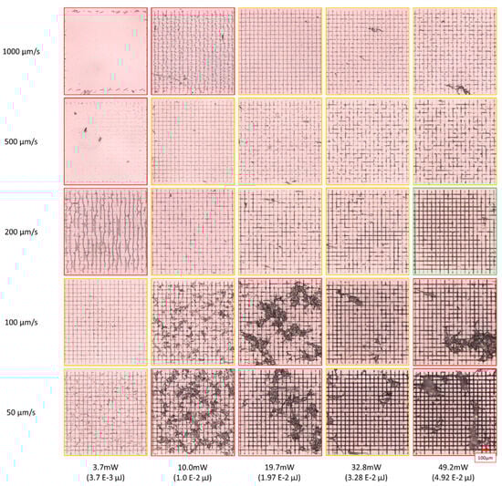 With these different prepolymers, a first set of resins were formulated (Table 2). Isobornylacrylate (IBOA) was used as partially biobased reactive diluent to adjust the viscosity of the resins. In one case (FORM-02) acryloylmorpholine (ACMO) was added to study the influence of the more reactive acrylamide on the performance of the TPP. Furthermore, TPO was added as a photoinitiator (1%), and MeHQ (0.05%) as a stabilizer. The biobased content of the formulation is also shown in Table 2, including the percentage of biobased material for the oligomer, the diluent, and the overall quantity, estimated as the percentage in weight of the components of biobased origin. The formulations were based on previous formulations for SLA and DLP printers [33,34,37]. The compatibility of these resins with TPP was subsequently studied through the fabrication of rectangular meshes, analysing the influence of laser pulse energy and scanning speed on the lateral and vertical resolution of the fabricated lines, as shown in Figure 1. The meshes were fabricated with the specialized system available at AIMEN and described in the Materials and Methods Section. Additionally, the same mesh was fabricated using a well-known commercial resin (Ormocomp©) as a benchmark.