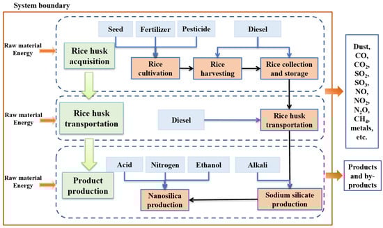 24]. However, previous research has mainly focused on the preparation process of rice husk-derived nanosilica (RH nanosilica) or the development of its applications. In contrast, there is a notable lack of literature that systematically evaluates the environmental impact of RH nanosilica prepared using the chemical reagents mentioned above from an environmental perspective.