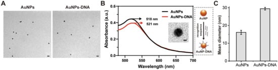 (A) TEM images of AuNPs and AuNPs–DNA. Scale bar: 20 nm. (B) UV absorbance of AuNPs–DNA and magnified TEM image of individual AuNPs–DNA. Scale bar: 5 nm. (C) DLS analysis of AuNPs and AuNPs–DNA.